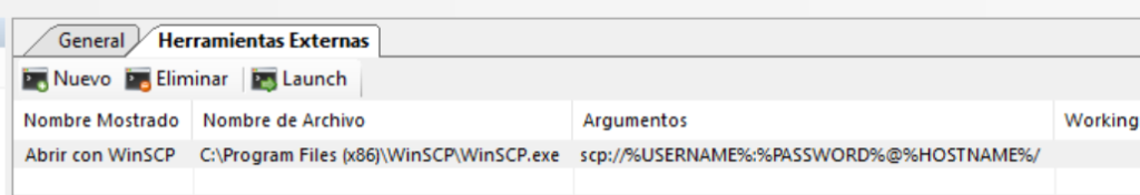 Sí, así de fácil es configurar mRemoteNG para que use como herramienta externa WinSCP y no sea necesario tener configuradas las conexiones en WinSCP.